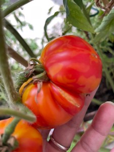 Tomatoes are ready to harvest when they are firm, fully colored, and pull easily from the vine. Avoid picking them too early or they may not ripen properly. If you notice any cracks or soft spots on your tomatoes, they should be harvested immediately to prevent spoilage. Waiting for them to be ripe is probably the longest part, in my opinion…and the hardest! Sometimes it can feel like it takes weeks to see that pink flesh turn bright red! you want to be aware of what the fully ripe color of the variety you are planting is, so you can always be ready to pick them!