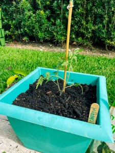 When planting your tomatoes, be sure to give them plenty of space to grow. From my reading, the “correct” spacing for plants is at least 2-3 feet apart to allow for good air circulation. I use 4×8 metal garden beds, so I only plant about 2 tomatoes in each bed, depending on the variety. Most of my tomatoes are container friendly and I use 12 in or 16in planters as well. If planting directly in ground or in containers, you still want to Plant your tomatoes deeply, burying them up to the first set of leaves. This will encourage strong root development and help your plants withstand hot, dry weather.